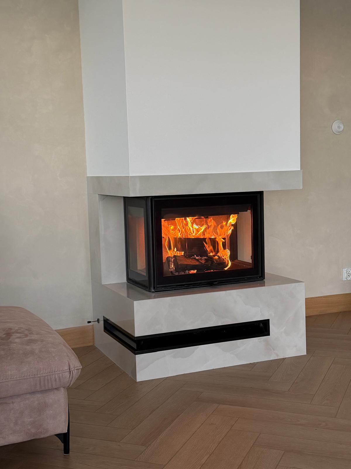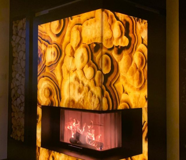 Kominek Spartherm z boczną szybą – zabudowa z podświetlanego onyksu