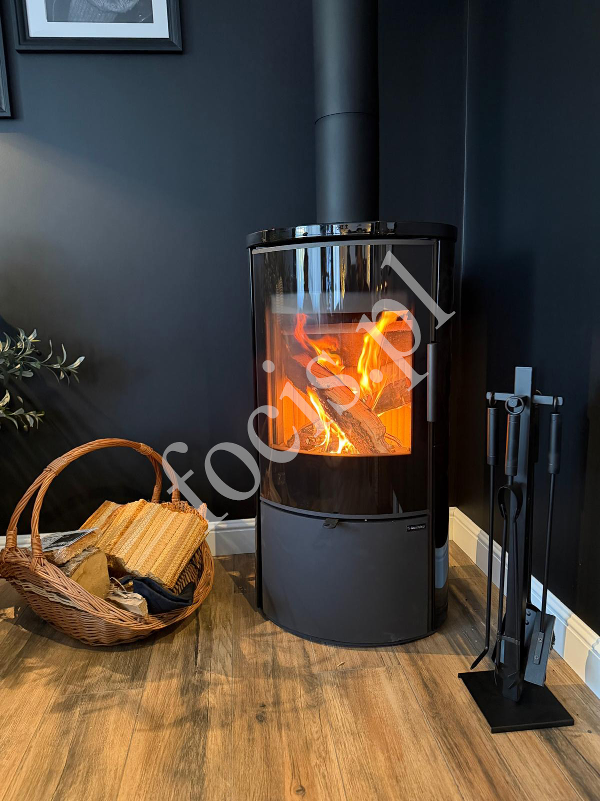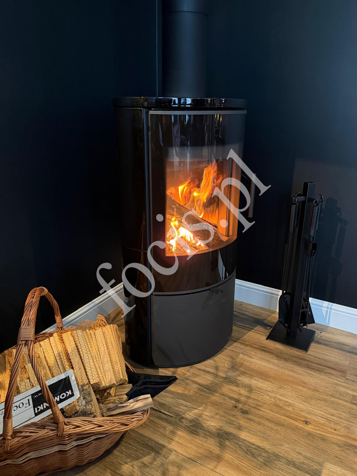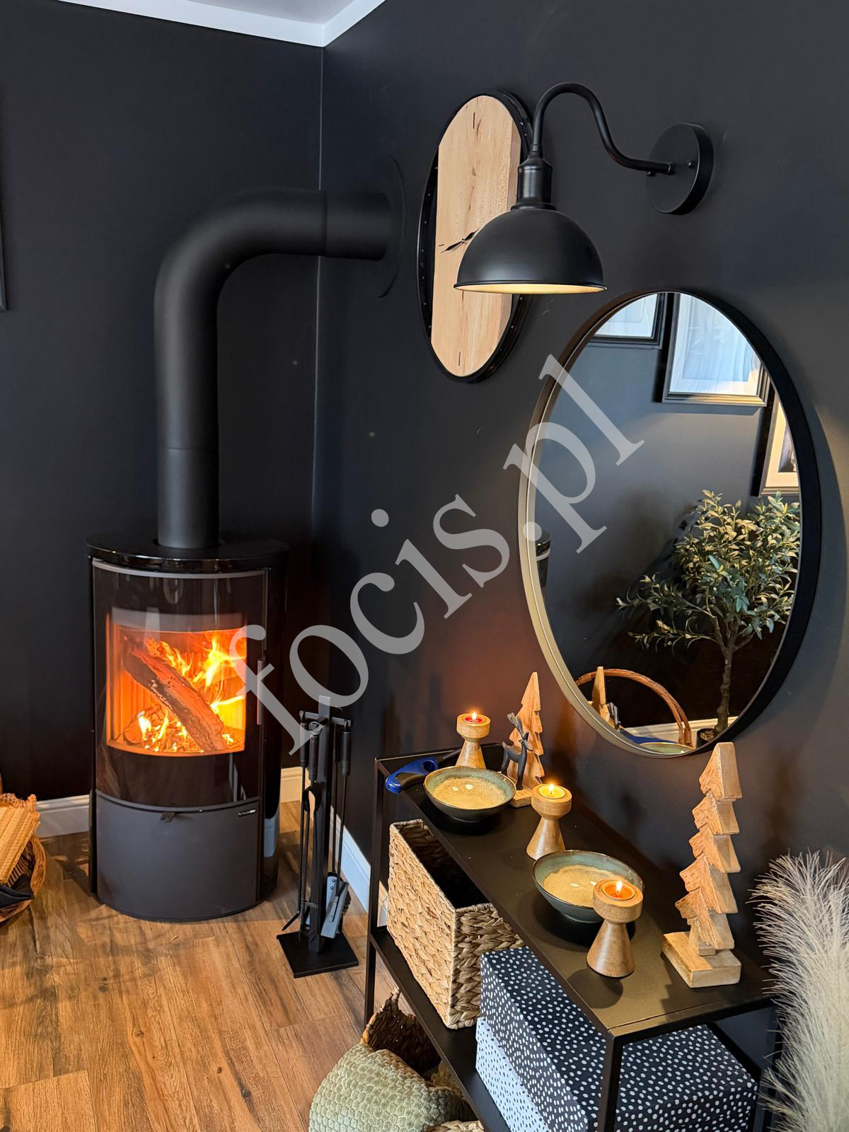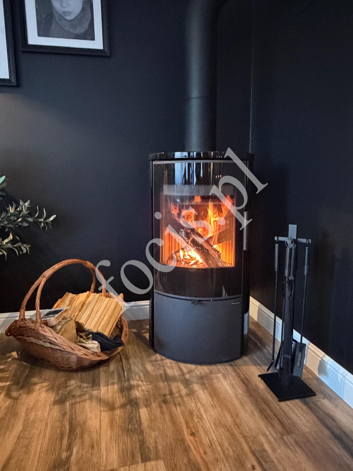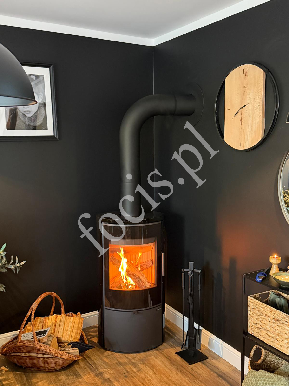 Czarny piecokominek doskonale komponuje się z ciemnymi ścianami, drewnianą podłogą oraz dodatkami w stylu loftowym lub nowoczesnym. Ogień widoczny przez dużą szybę tworzy przytulną atmosferę i sprawia, że piecokominek staje się centralnym punktem pomieszczenia.
