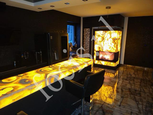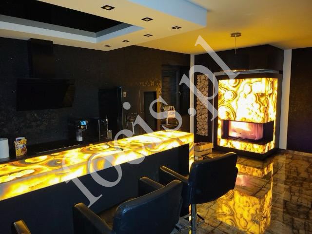 Zabudowa kominka została wykonana z onyksu, jednego z najbardziej ekskluzywnych kamieni naturalnych, którego kolorystyka i struktura prezentują się jak prawdziwe dzieło sztuki.