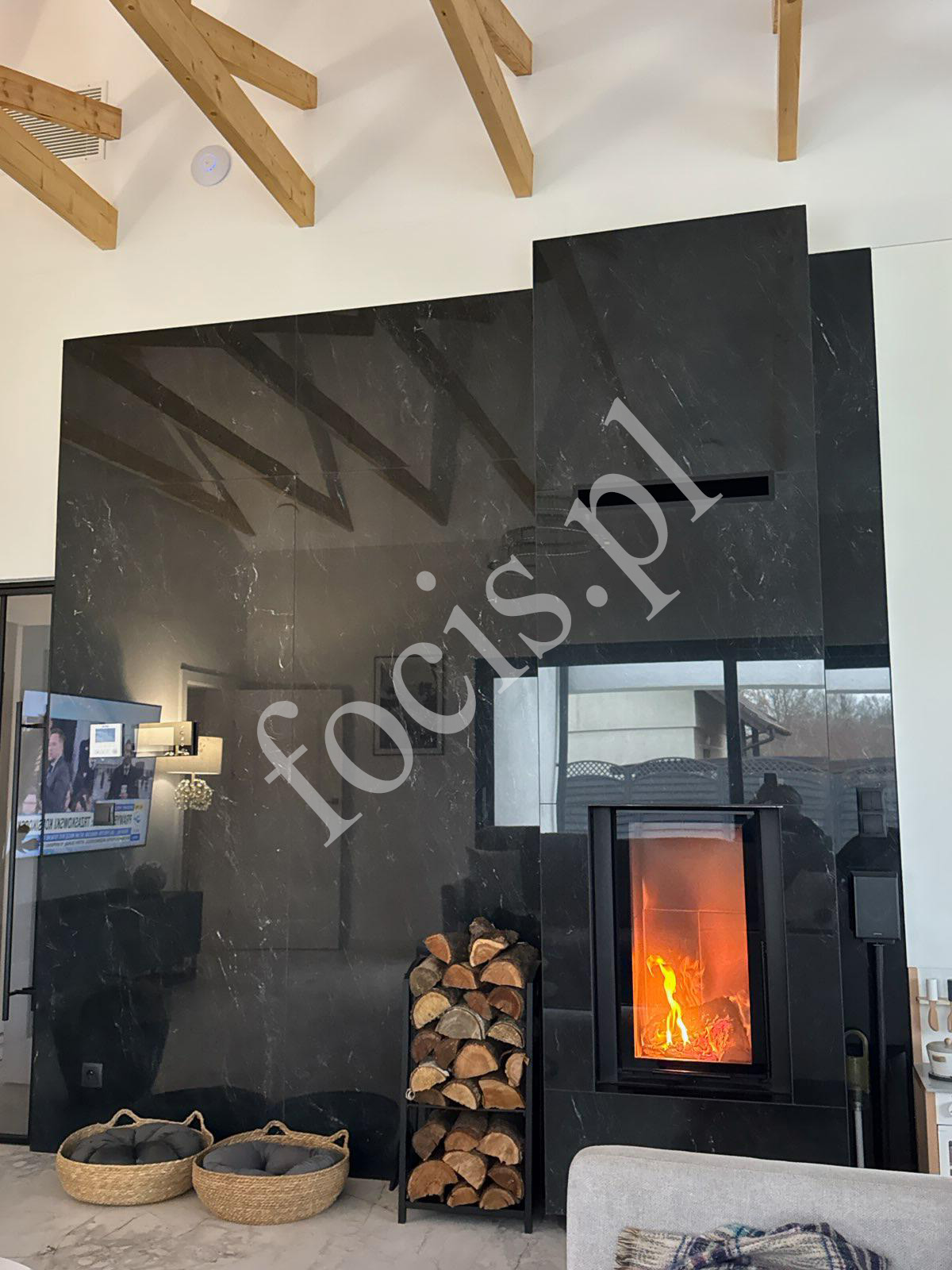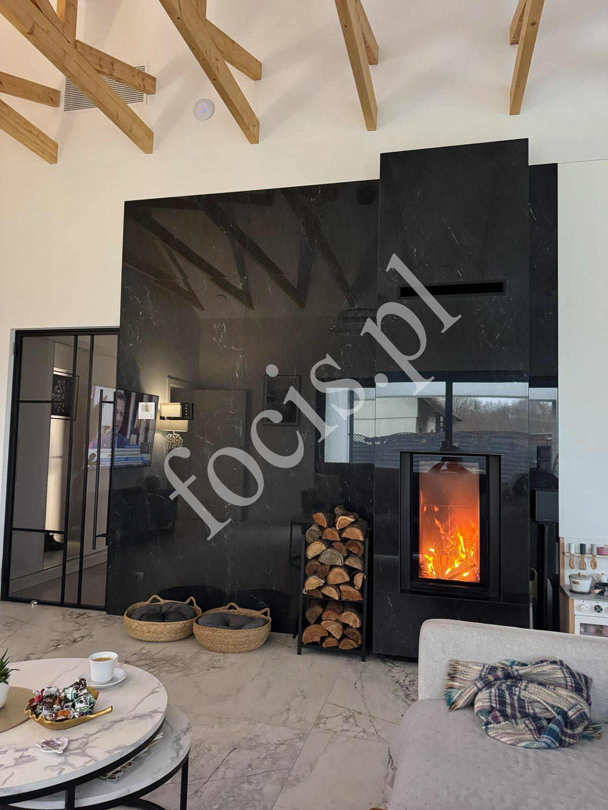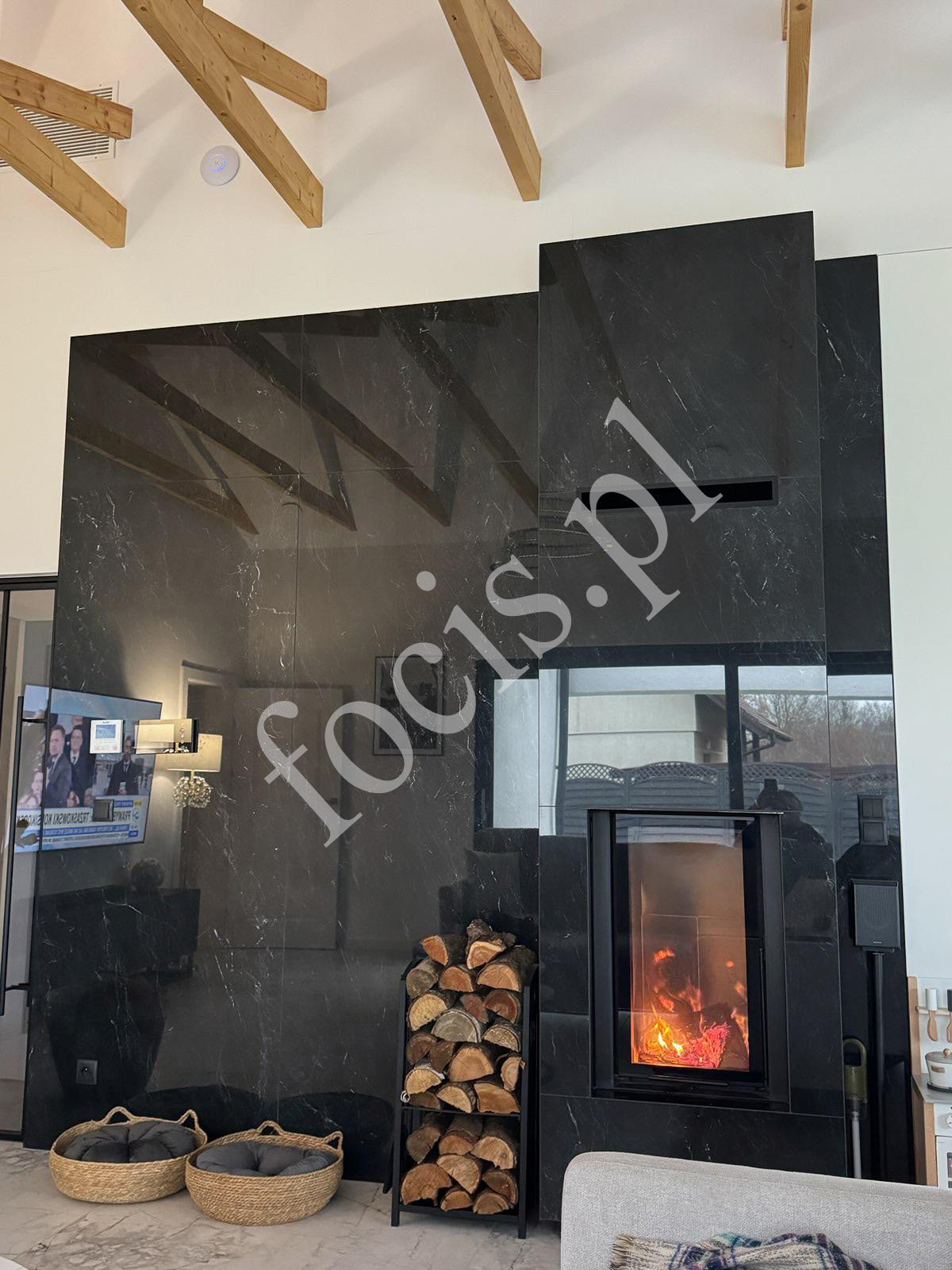 Ciemna, kamienna powierzchnia idealnie komponuje się z nowoczesnym wystrojem wnętrza, podkreślając minimalistyczną formę kominka i kontrastując z jasnymi elementami aranżacji.