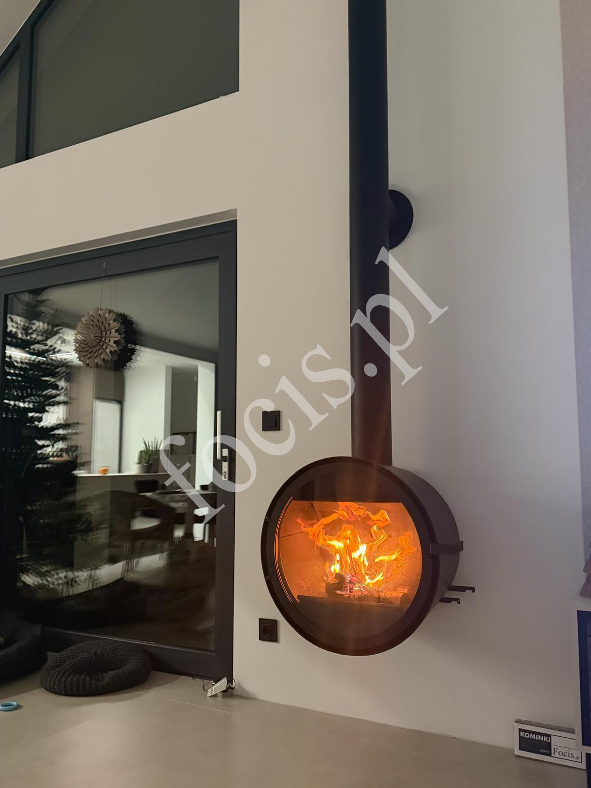 Półokrągła szyba kominka pozwala na doskonałą ekspozycję płomieni, które są widoczne z różnych części pomieszczenia. To sprawia, że kominek wiszący Rocal pełni nie tylko funkcję grzewczą, ale również dekoracyjną – staje się żywym elementem architektury wnętrza.