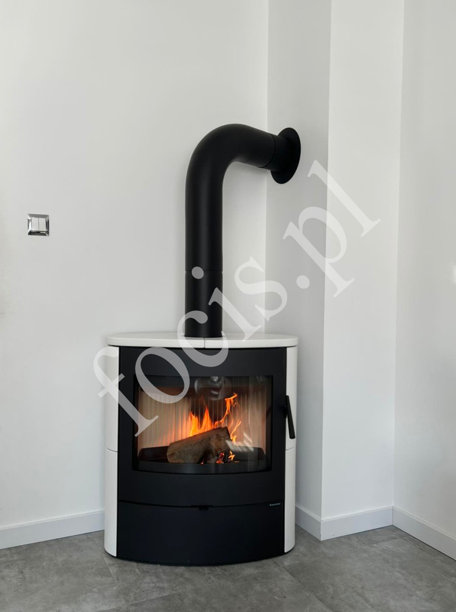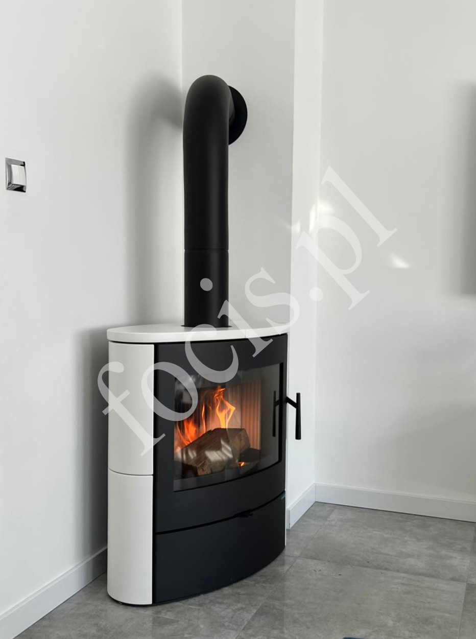 Ceramiczna obudowa w połączeniu z czarnym frontem i stalowym przewodem kominowym tworzy harmonijną, minimalistyczną kompozycję. To idealne rozwiązanie dla osób szukających hasła: „biały piec kominkowy do salonu” lub „nowoczesny kominek wolnostojący z ceramiką”.