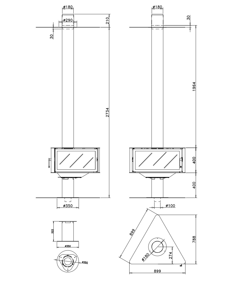 trzyszybowa konstrukcja – ogień widoczny z każdej strony pomieszczenia