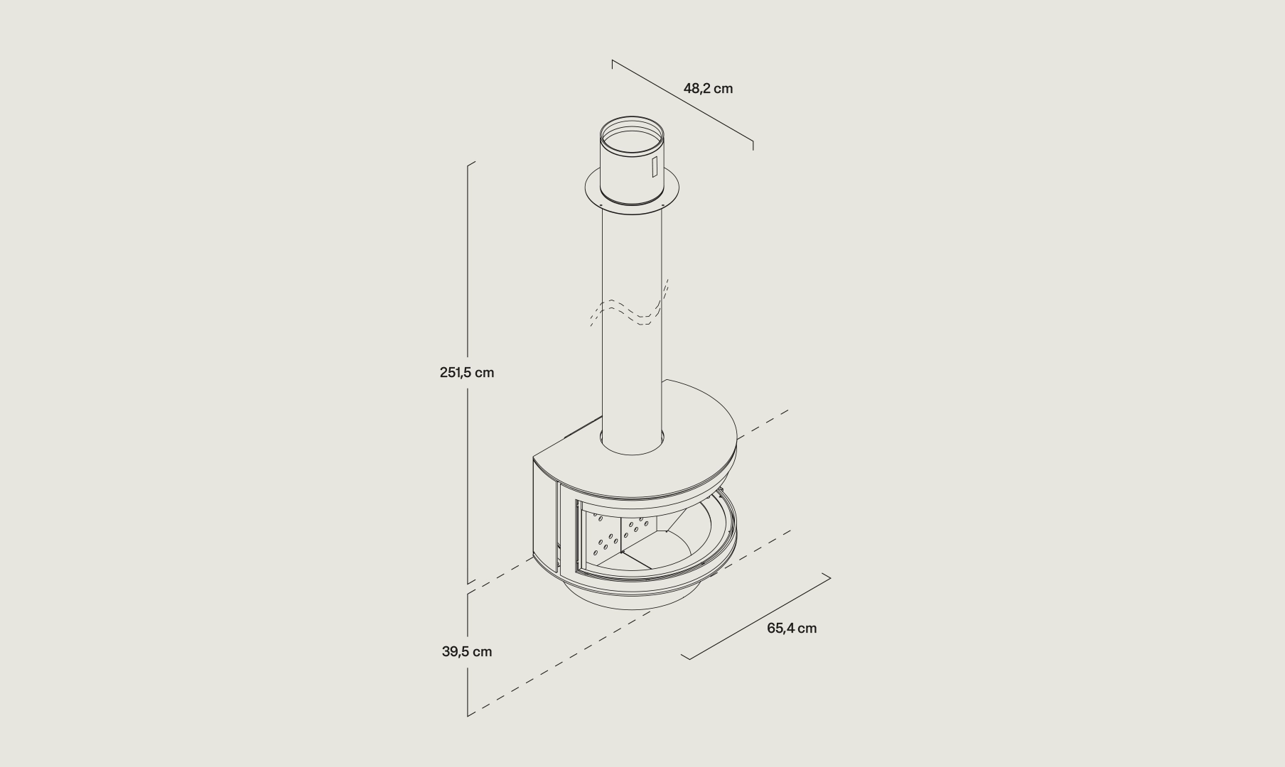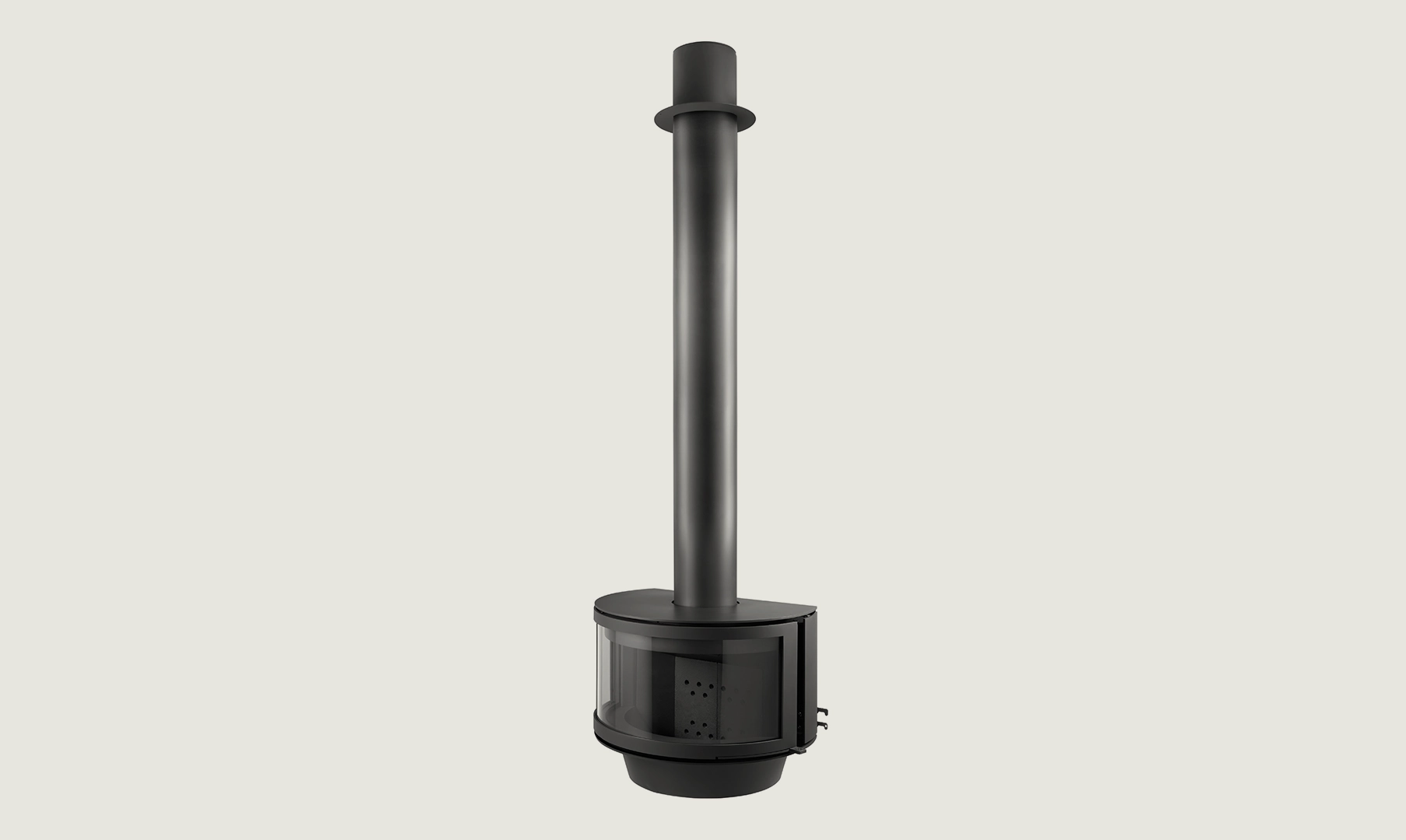 Kominek wyposażony jest w dużą, zaokrągloną szybę frontową, która zapewnia doskonały widok na palenisko. Ogień jest pięknie wyeksponowany i widoczny z szerokiego kąta, co potęguje wrażenie ciepła i domowego klimatu. Delikatnie zakrzywiona linia szkła harmonijnie współgra z okrągłą bryłą kominka, podkreślając jego nowoczesny charakter.