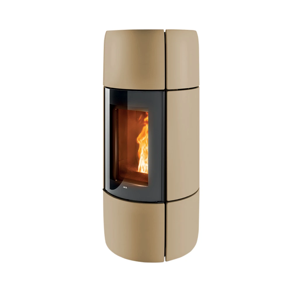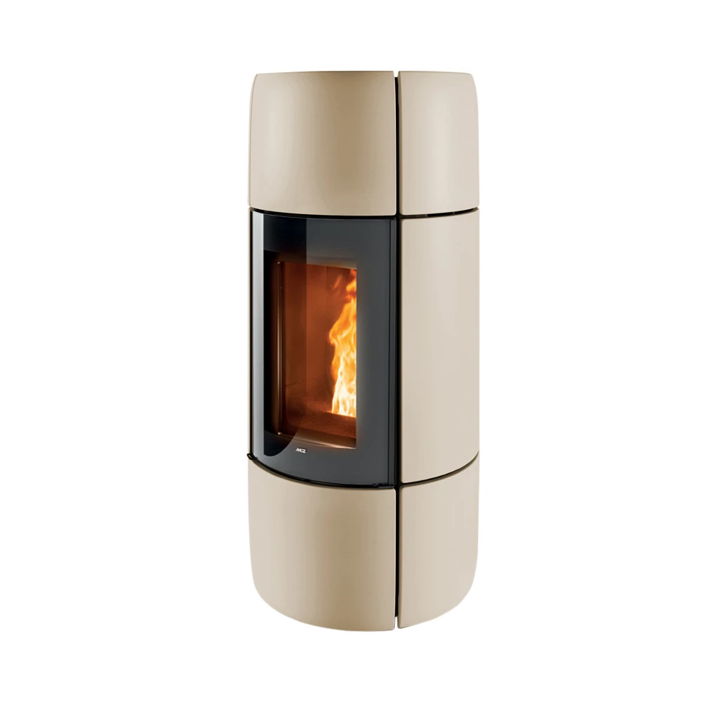 Piecyk na pellet, który przy swojej płynnej i delikatnej formie ukazuje elegancję elementów ceramicznych. Bez widocznych na froncie kratek. Ciepło wydostaje się przez jego górną część. Sterowany inteligentnym systemem Maestro.