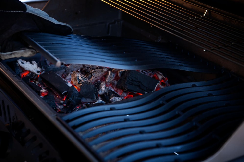 Przekształć swój ulubiony grill gazowy Napoleon w grill na węgiel drzewny i wędzarnię, aby uzyskać aromat dymu z węgla drzewnego. Żeliwna taca na węgiel drzewny i do wędzenia jest łatwa w użyciu. Zdejmij ruszty i płyty do smażenia z co najmniej dwóch palników.