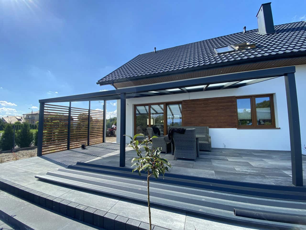 Klienci mogą wybrać pomiędzy różnymi opcjami pokrycia dachu, takimi jak szkło lub poliwęglan o grubości 16 mm. Szkło zapewnia elegancki, przejrzysty wygląd, który doskonale wpisuje się w nowoczesne projekty domów i ogrodów, umożliwiając naturalne oświetlenie przestrzeni pod pergolą. Poliwęglan jest lekkim, ale wytrzymałym materiałem, który oferuje doskonałą ochronę przed UV oraz zmniejsza nagrzewanie się przestrzeni, co jest szczególnie wartościowe podczas upalnych dni.